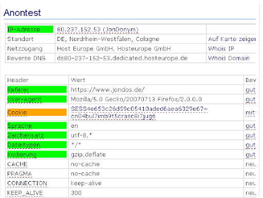 IP-Adresse | 212.227.103.74 (JonDonym) JonDonym wird zum Anonymisieren verwendet. | |
